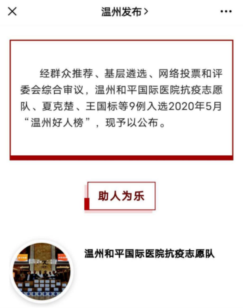 醫(yī)院榮獲“溫州好人”集體稱號,醫(yī)護人員呂寧寧、侯文杰等獲得感動甌海100人、最美抗疫先鋒等稱號。