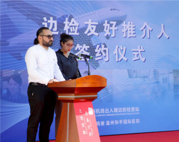 溫州機場出入境邊防檢查站站長劉浩與豪孟德、蘇瑪夫婦簽約,并為他們頒發(fā)榮譽聘書。