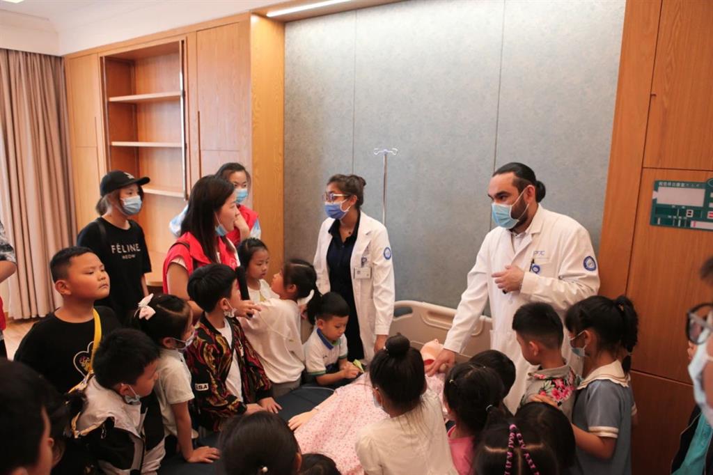 體驗完當“小小醫(yī)生”,和平國際醫(yī)院跨國醫(yī)生蘇瑪和豪孟德夫婦向小朋友們講解了“止血和包扎”、“心肺復蘇”等基本家庭急救知識,小朋友們熱情高漲,爭先想要進行演練。