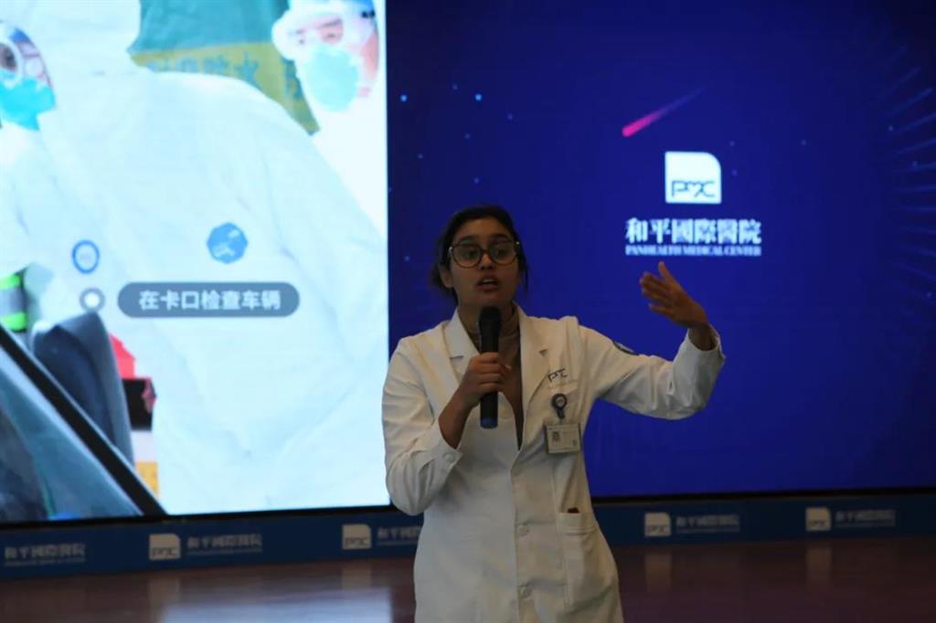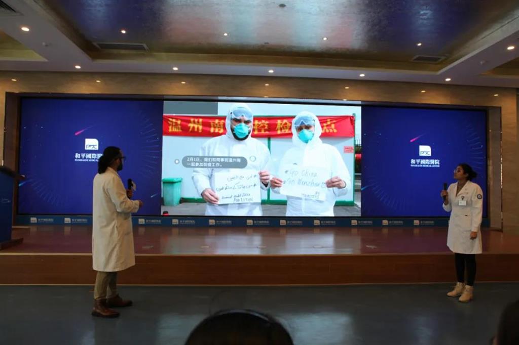 作為溫州最美抗疫人,和平國際醫(yī)院的跨國醫(yī)生,來自毛里求斯的蘇瑪和來自巴基斯坦的豪孟德分享了他們的抗疫故事。“在疫情期間,家里人讓我回去,但是我拒絕了,我必須留在這里,這是我的使命。”蘇瑪說道。同學(xué)們紛紛為她的精神鼓掌。
