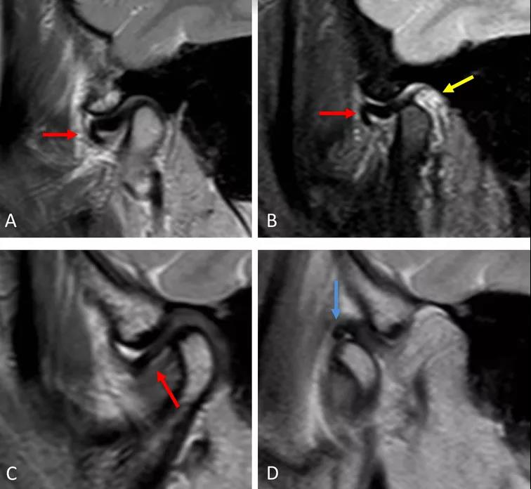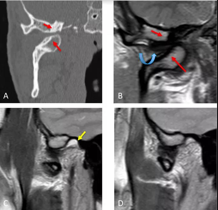 A圖示:閉口位時(shí),顯示下頜骨髁突前上側(cè)面硬化,前方扁平的椎間盤移位(紅色箭頭)。