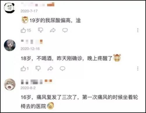 類似像郭麒麟一樣,十幾、二十多歲發(fā)生痛風的,也不在少數(shù)?!锻达L748例臨床特征分析》提到,2008-2013年,青年患者所占比例逐年上升,分別為 39% 、39. 4% 、40% 、42% 、48% 、52% ,甚至超過了中老年患者。②