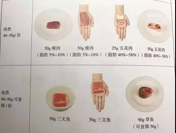 一般,一個手掌心(不包括手指)大小及厚度的肉約50克,豬肉、雞肉、鴨肉和魚肉等瘦肉都可以按照這種方法計算。如果是脂肪更少的肉,比如蝦貝類,則一個掌心的量要稍微多點,約為85克左右。