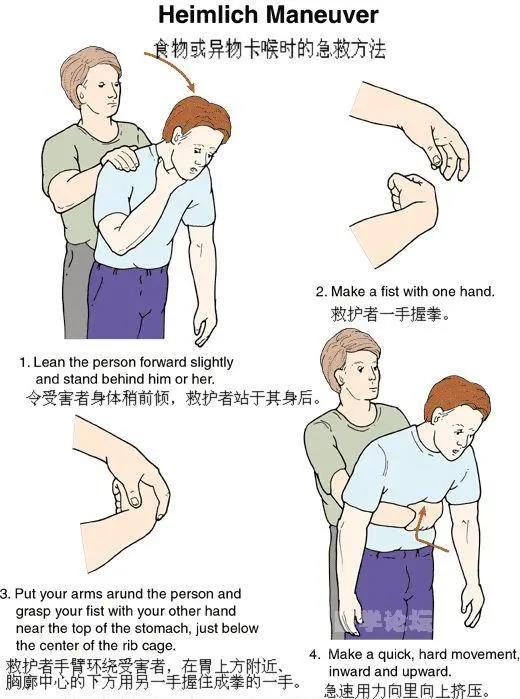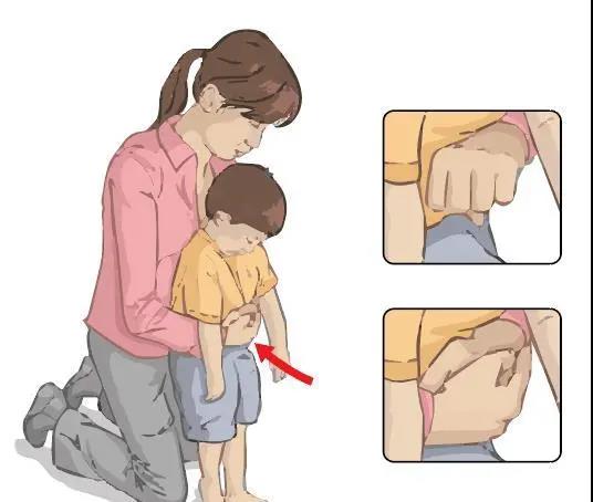 可采用上述用于成人4個步驟的②③④三點,或稍稍彎下腰去,靠在一固定的水平物體上(如桌子邊緣、椅背、扶手欄桿等),以物體邊緣壓迫上腹部,快速向上沖擊。重復之,直至異物排出。